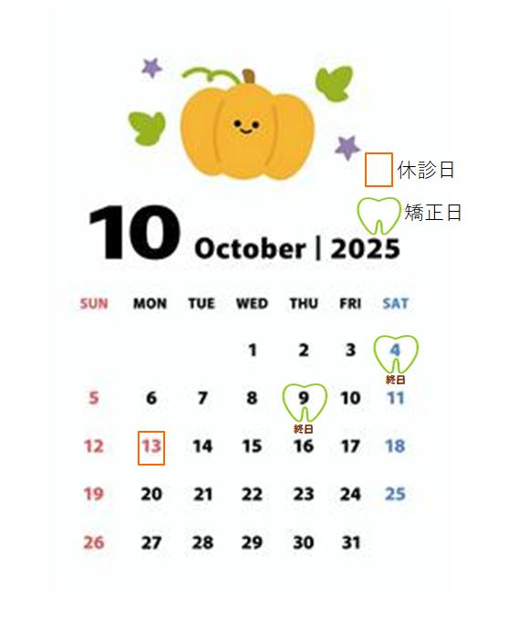 10月は通常通り祝日(10/13月曜日)のみ休診日となっております。