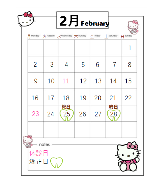 2月は通常通り祝日(2/11水曜日・2/23月曜日)のみ休診日となっております。